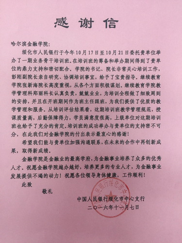 中国人民银行绥化市中心支行2016年业务骨干培训班。2016年10月,我院举办“中国人民银行绥化市中心支行2016年业务骨干培训班”本期培训班培训课程设置合理、内容丰富,课程涵盖金融、公文写作、爱国主义教育基地参观考察、拓展训练、心理调适等方面内容。人民银行绥化市中心支行对我院此次培训的承办工作给予了高度认可。王磊副行长在结业式上表示:“感谢哈尔滨金融学院对本期培训工作的全力以赴、积极筹划,认真研究培训的每个环节,组织得力,无论从课程、师资的配备,以及培训班的管理和后勤保障,都做了细致的安排,确保了培训班顺畅有序地开展。”