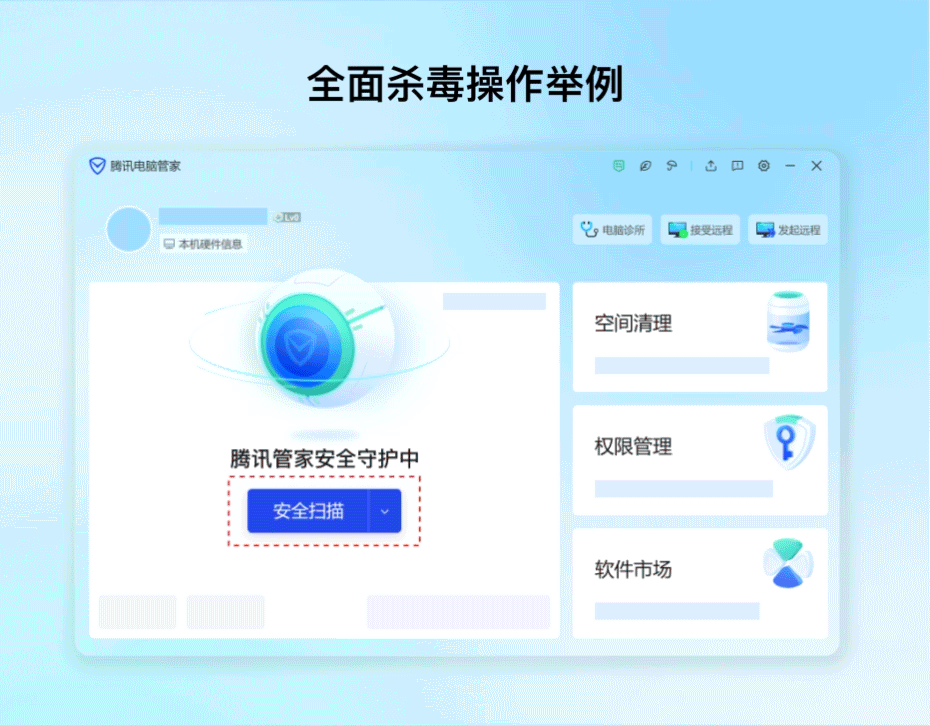 微信安全中心提醒:若打开了可疑内容或电脑上出现可疑行为,应及时退出电脑所登录的重要账号,并对电脑进行全面查杀,确保木马病毒被清理干净之后再正常启用电脑。日常工作生活中,可定期使用杀毒软件对电脑环境进行安全扫描,清理潜在风险。下面以电脑管家为例,轻松几步完成全面杀毒。