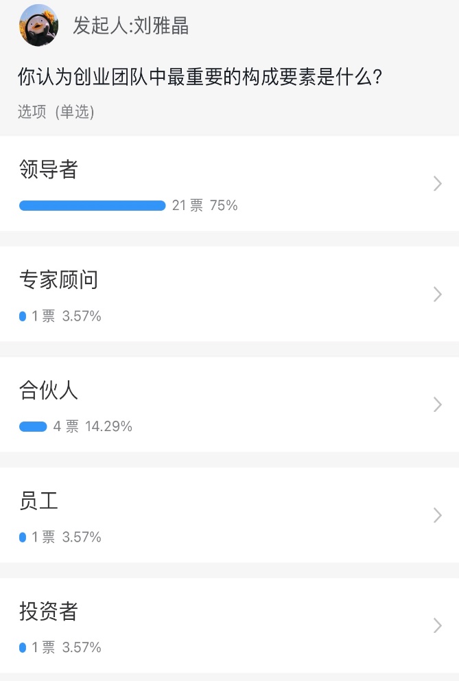课中在每一个重点知识点讲解完以后发起投票,用以了解学生对知识点的掌握情况,同时也为下一个知识点的导入起到“穿针引线”的作用。同时在课中不定时地向学生进行提问,通过一些开放式的问题,激发学生对创新创业实践活动的兴趣,也能够时时监测学生的听课情况。