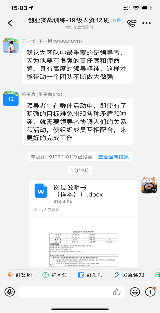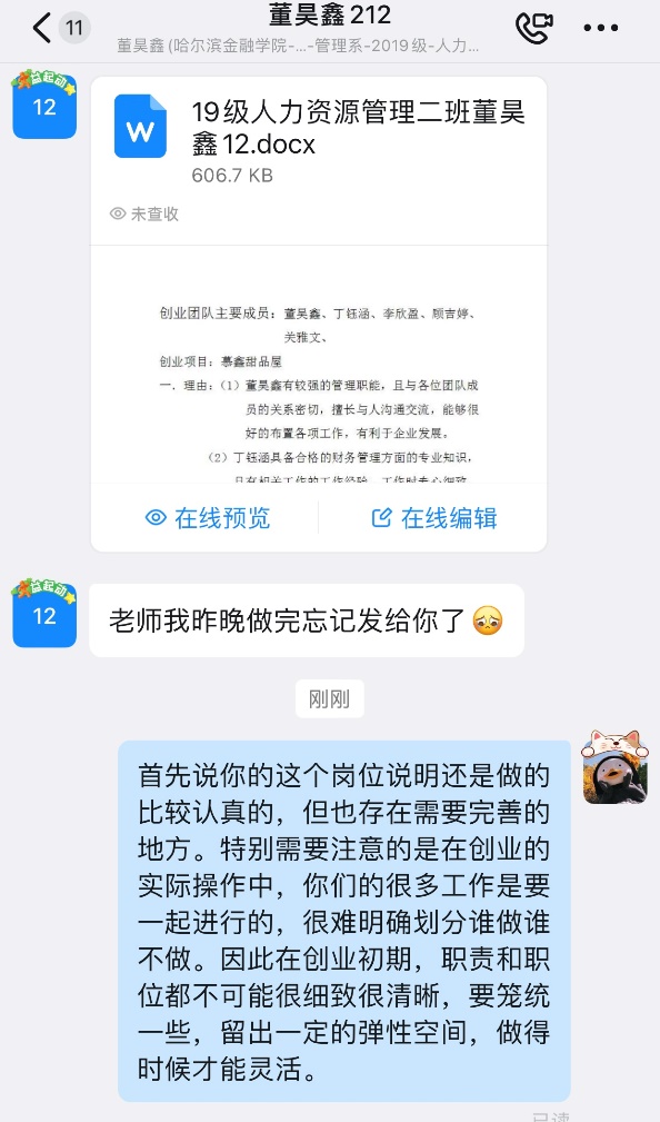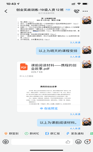 其次,向学生提前发布本次课程的安排及自习任务,将本次课的案例相关阅读资料发送至钉钉群,让学生能够提前结合案例自主思考创业团队组建与管理的相关知识点。