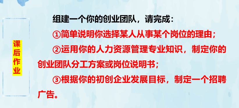 本次课程内容为:创业团队人员分工及岗位职责的设定(2学时)。