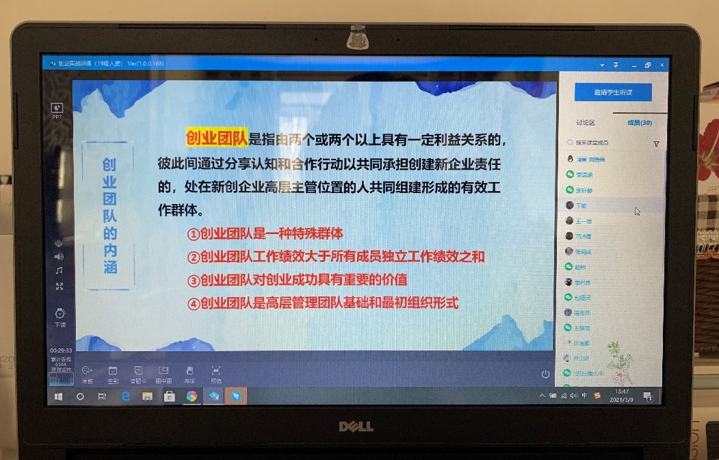 本次课程选用“腾讯课堂+钉钉”的双平台授课模式,运用腾讯课堂直播进行创业团队相关理论知识的讲解,并通过腾讯课堂和钉钉群与学生实现实时互动;使用钉钉群进行课前测试与课后作业的布置,在教学过程中结合钉钉群中的“投票”功能,并将相关的补充材料发至群内供学生随时查看。教学教程中平台稳定,未影响上课效果。