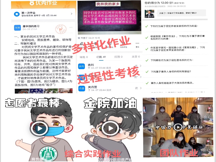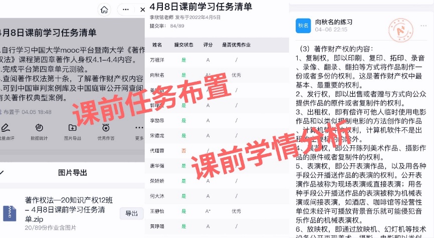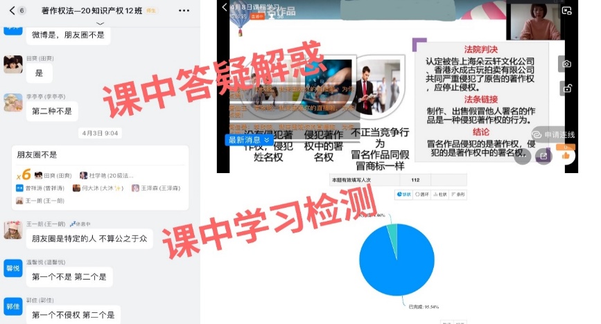 《著作权法》课程建立钉钉群、微信群,充分利用线上优质的教学资源,采用中国大学mooc及学堂在线平台中的课程,学习中国法院网、中国庭审公开网、中国裁判文书网及法律之星网的资料,按照教学大纲的内容对在线课程进行分段设计,课前按照章节给学生发送公告及平台学习内容并完成任务清单事项,学生自己安排时间,通过平台的学习,课前任务的布置及相关案例资料的查阅可以实现对基础知识的初步了解和掌握。在线直播授课环节选取受学生欢迎的钉钉直播,按照课程表的时间教师和学生相见云端,与学生在空中智慧课堂进行互动,借助平台的多种智能化功能检查学生的听课状况、学习情况、互动情况,以问题为导向,激发学生学习兴趣,并通过直播及智能工具帮助学生理解与掌握课程的重点、难点。云端智慧课堂的建立使得教师可以充分利用现有的技术平台,借助慕课与在线直播,依托多种智能化的教学工具,呈现丰富多彩的智慧课堂,促进并激发了学生的学习热情,提升了课堂教学的质量,确保学生在云端课堂学习学有所获,学有所成。