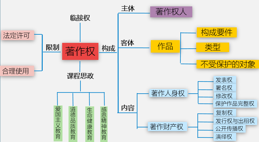 教学目标:通过课程的学习,使学生掌握著作权法的基本理论和知识,具备深入学习和研究著作权法的专业素养,能运用专业知识分析和处理著作权案件,并在讲授专业知识的过程将思政元素贯穿课程始终,学生在学习专业知识的同时建立崇高的理想信念,高尚的道德品质,具有服务于建设社会主义法治国家的责任感。