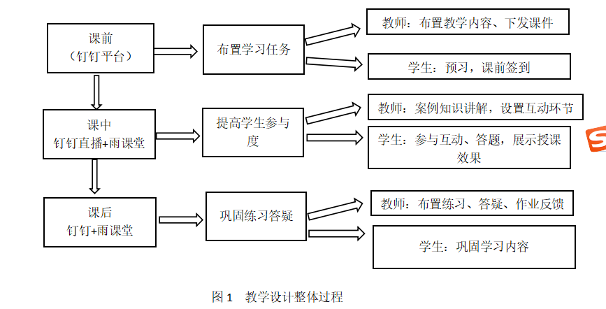 教学流程设计及教学目标:上课前布置学习内容,将课件发送到钉钉群,供学生学习使用;课中注重与学生互动交流,多种方法加强课堂管理,主要是运用雨课堂将大部分的讨论题改为选择题,这样有助于提高学生的参与度,帮助学生消化课程内容,同时也有助于老师了解学生当前学习的课堂状态;课后知识巩固、答疑解惑。每堂课后都给学生留有部分作业,并及时批改作业,对学生的问题进行答疑,这样对学生的整体学习情况有一个及时的把握,下次授课时将学生的作业情况进行及时反馈,这样不仅帮助学生复习上一节的授课内容,对存在的疑问和问题也能及时矫正。这样课前、课中、课下各个环节形成一个完整的教学过程,从而保证线上教学的效果,具体设计见下图1所示。